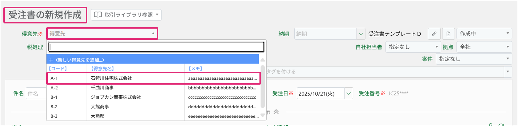 ※[新しい得意先を追加]より、受注書作成画面で得意先を追加することもできます。
