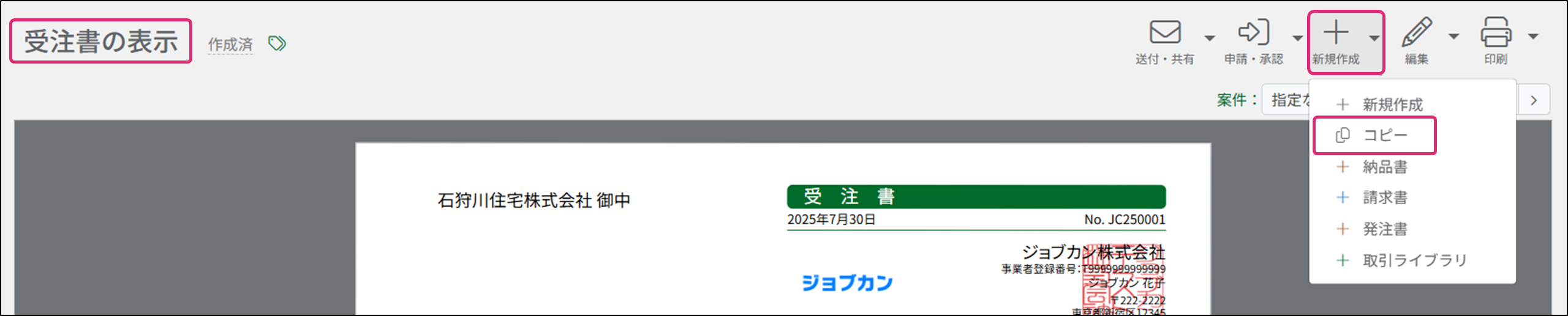 3. [受注書の表示]画面が表示されます。画面右上の[+新規作成]→[コピー]をクリックします。