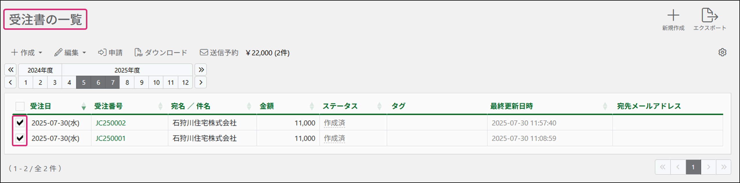 2. [受注書の一覧]画面が表示されます。流用元になる複数の受注書のチェックボックスにチェックを付けます。