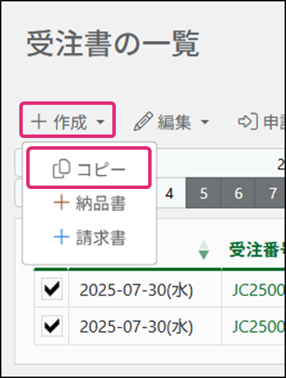 ※付番設定が[手動]の場合、枚数に関わらず[受注書の一覧]画面からコピーをすることはできません。