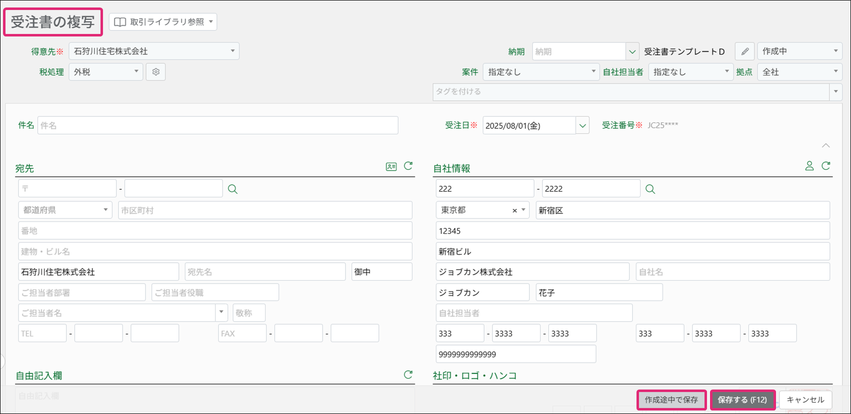 5. [受注書の複写]画面が表示されます。必要に応じて修正を行い、[保存する]または[作成途中で保存]をクリックします。