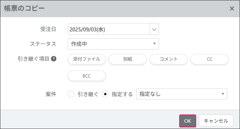 [引き継ぐ]を選択した場合、複写元の案件を引き継ぎ帳票が作成されます。