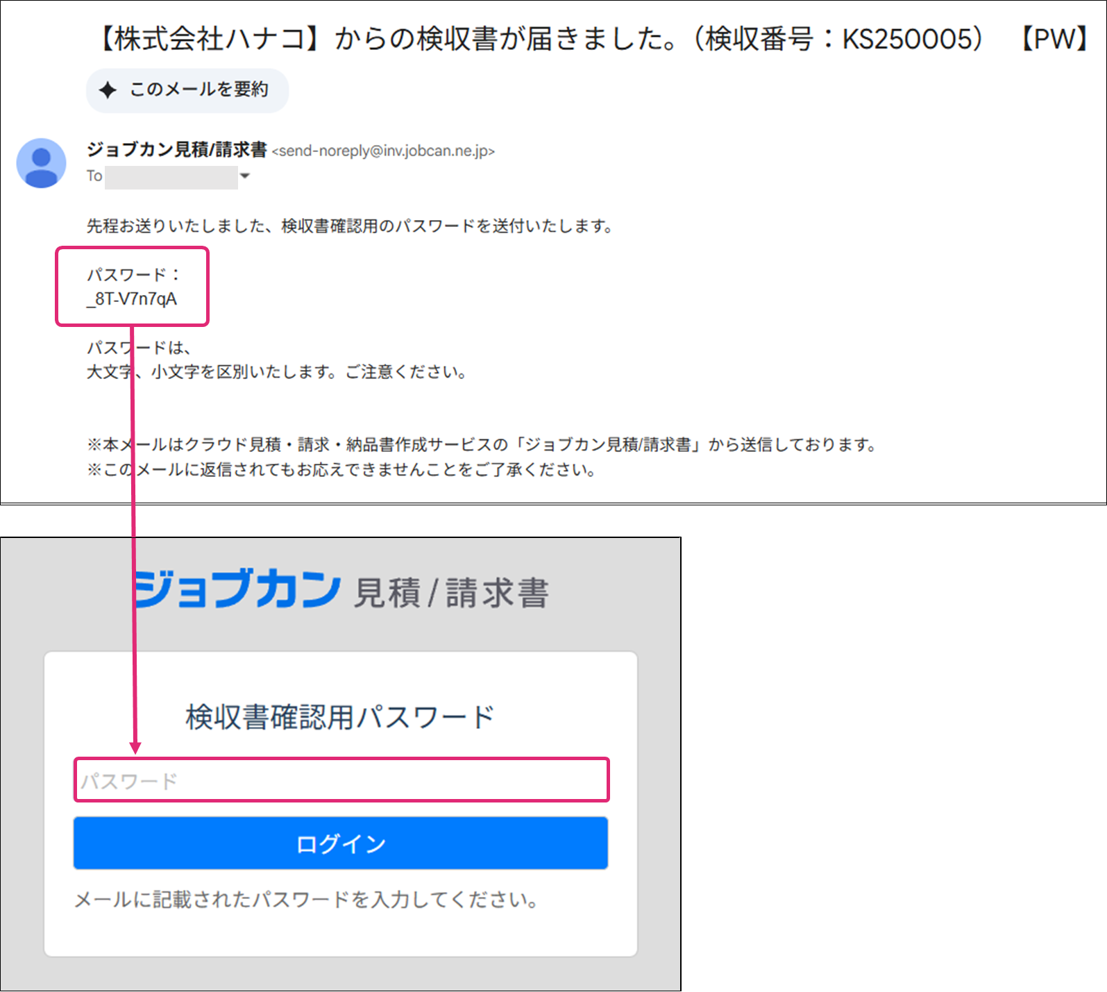 1. ジョブカン見積/請求書からメールが届きます。パスワードが設定されている場合は、2通目にパスワードメールが届きます。帳票確認URLが記載されている、本文メールをクリックします。