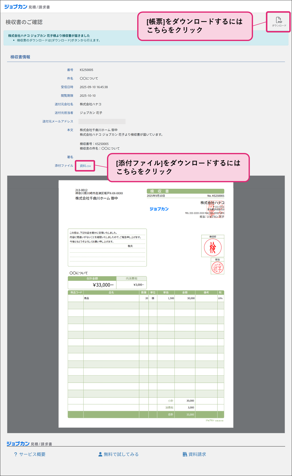 3. [検収書のご確認]画面が表示されます。帳票をダウンロードするには、画面上部の[ダウンロード]をクリックします。添付ファイルをダウンロードするには、[添付ファイル名]をクリックします。