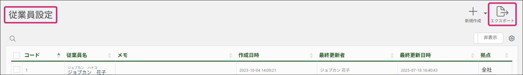 2. [従業員設定]画面が表示されます。画面右上の[エクスポート]をクリックします。