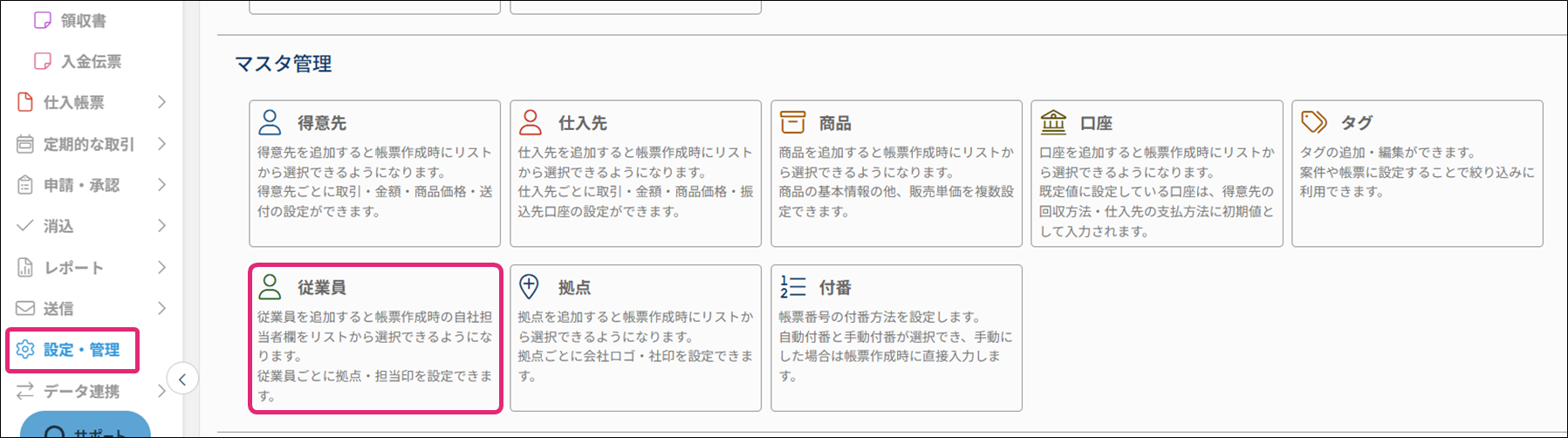 1. メニュー [設定・管理]→[マスタ管理]→[従業員]をクリックします。