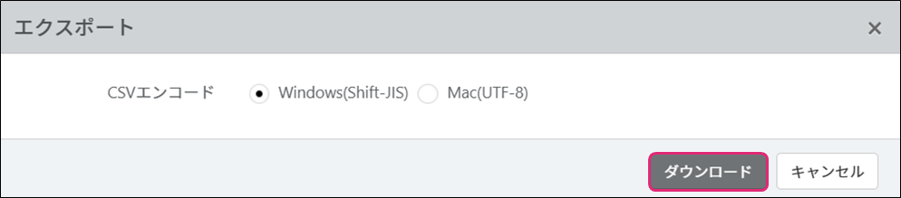 ※[Mac(UTF-8)]を選択した場合、ダウンロードしたCSVファイルをそのままExcelで開くと文字化けすることがあります。これはExcelの仕様によるためで、文字化けせずに開くには下記の「[Mac(UTF-8)]を選択したCSVファイルをExcelで開くには」をご覧ください。
