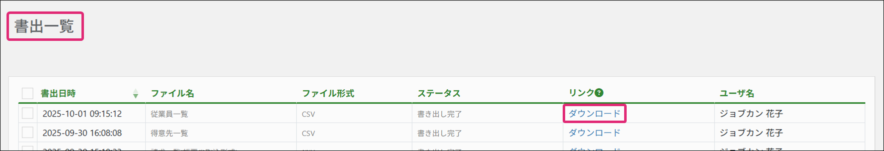 8. [書出一覧]画面が表示されます。該当データの行の[ダウンロード]をクリックします。