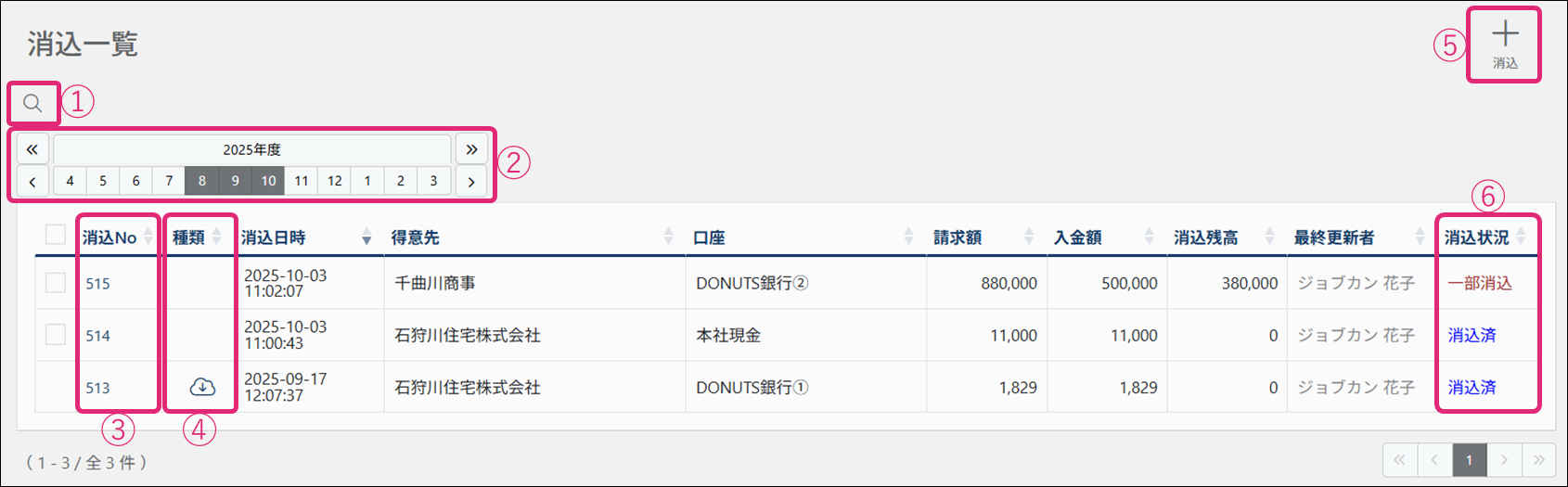 | ⑥ 消込状況 | 消込の状況が表示されます。 ・ 消込済 :請求額と入金額が一致し、全て消込できている状態 ・ 一部消込:請求額と入金額に差額があり、一部消込できていない状態 |