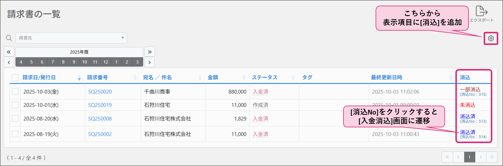 また[請求書の一覧][合計請求書の一覧][入金伝票の一覧]画面では、歯車マークより[消込]を表示項目に追加することで、消込状況を確認できます。[消込No]をクリックしますと、[入金消込]画面に遷移します。
