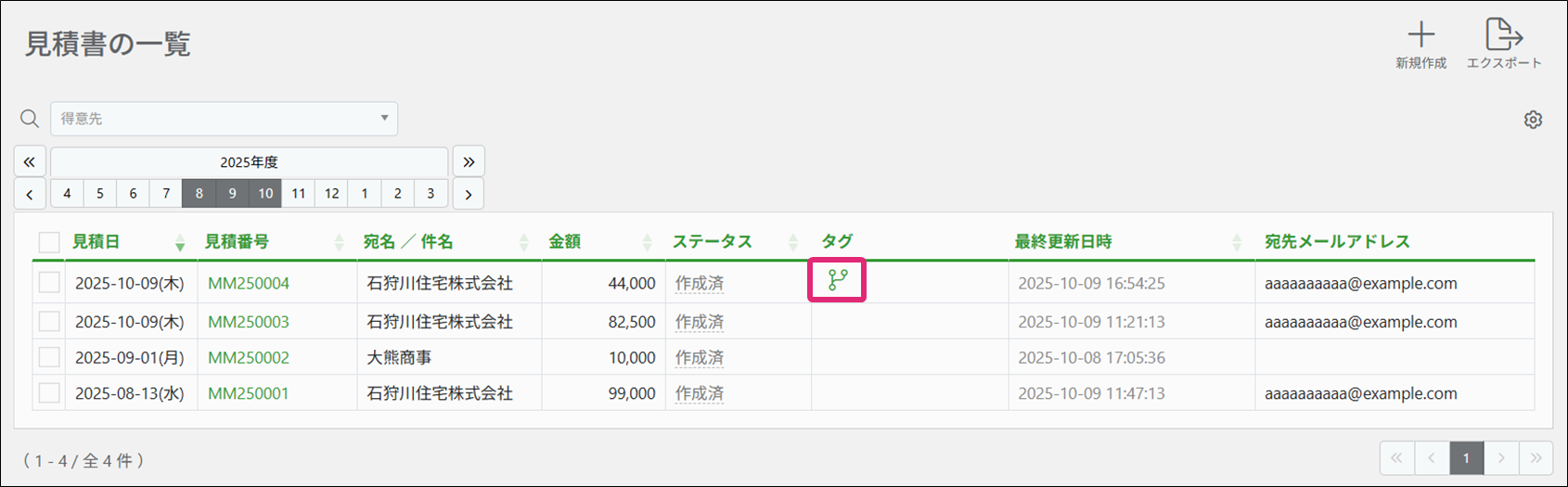 こちらも作成済みの見積書を流用し、新たに見積書を作成しますが、旧バージョンの見積書は非表示になり、最新バージョンの見積書のみが表示されます。