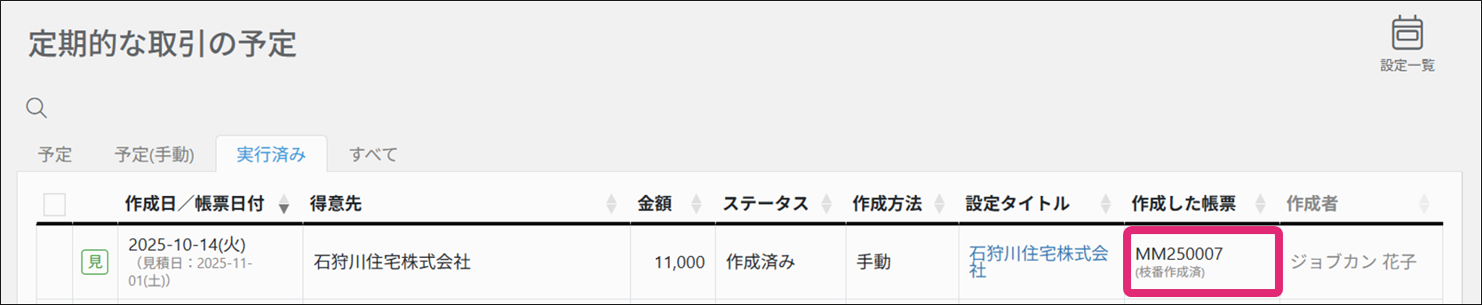 過去の履歴として一覧に表示されます。 枝番を作成した場合は、「(枝番作成済)」と表示されます。 |