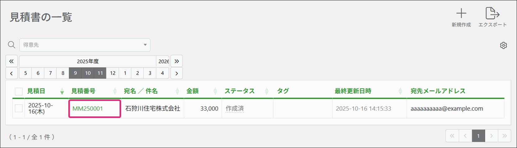 2. [見積書の一覧]画面が表示されます。履歴を確認したい見積書の[見積番号]をクリックします。