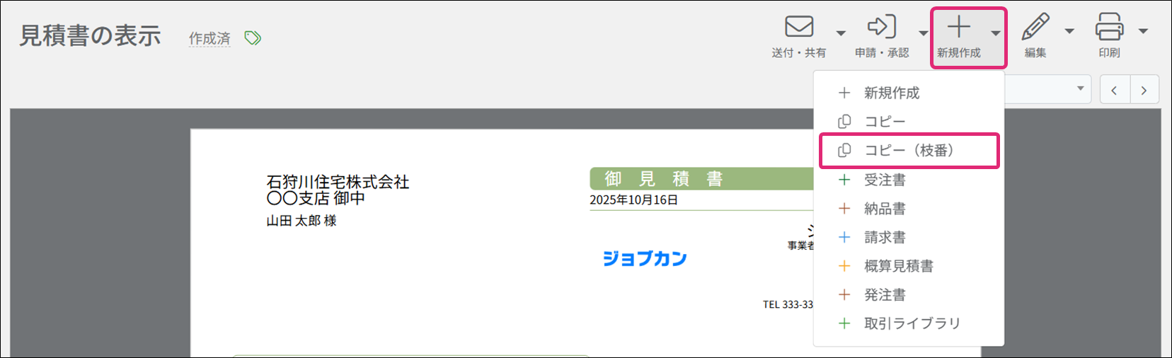 3. [見積書の表示]画面が表示されます。画面右上の[+新規作成]→[コピー(枝番)]をクリックします。