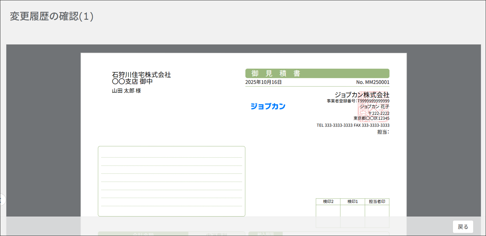 3. [見積書の表示]画面が表示されます。画面下部の[変更履歴]を確認します。
