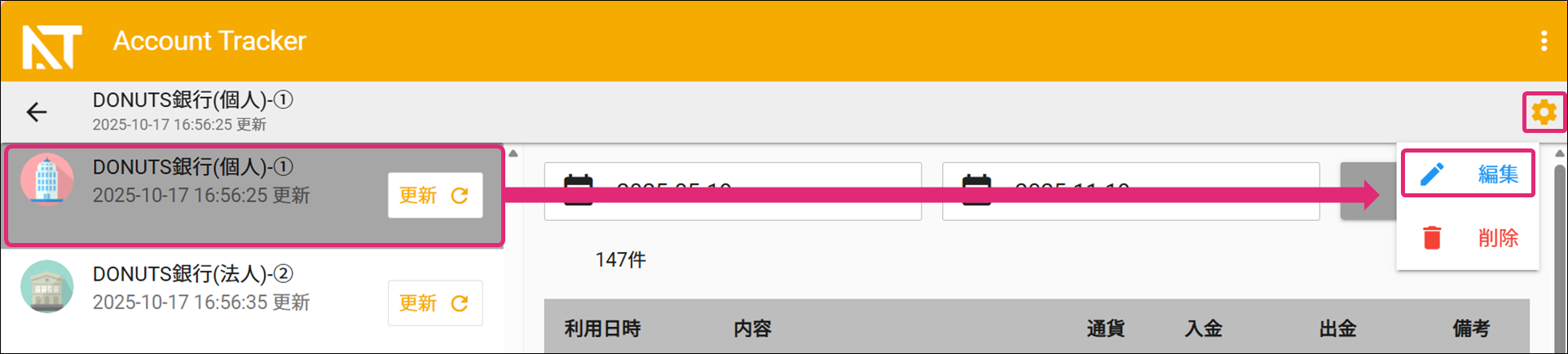 2. 該当の金融機関を選択し、画面右上の[歯車]→[編集]→[〇〇銀行サイトへ]をクリックします。