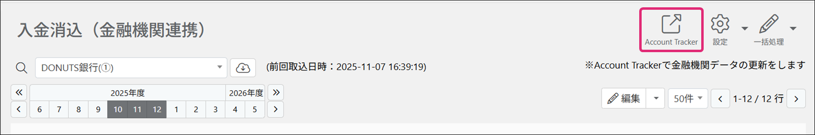 2. [入金消込(金融機関連携)]画面右上の[Account Tracker]をクリックします。