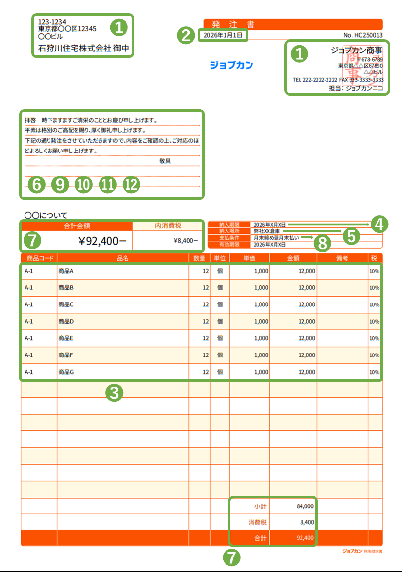 以下は必須記載項目を満たした発注書の作成例です。
