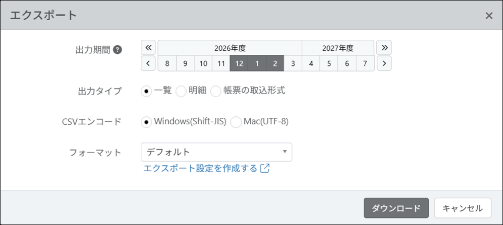 また、エクスポート時に「出力期間」「出力タイプ」「CSVエンコード」等の選択が可能です。
