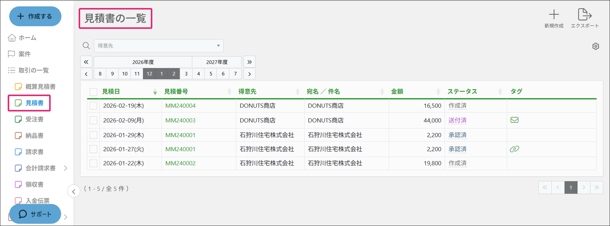 画面左の帳票名(見積書・請求書など)をクリックし、一覧画面を開きます。