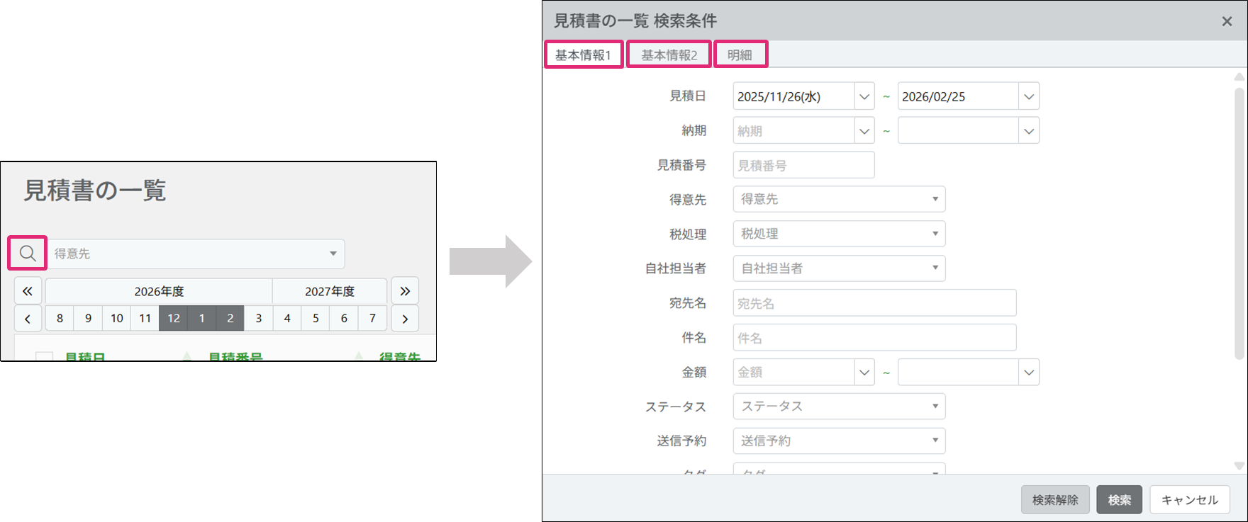 画面左上の「虫眼鏡(検索条件)」から、期間・得意先・宛先・件名・金額・ステータス・タグ等で絞り込みができます。