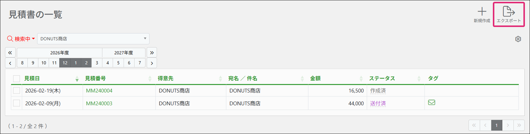 画面右上の「エクスポート」から、一覧画面に絞り込んだ帳票をエクスポートします。