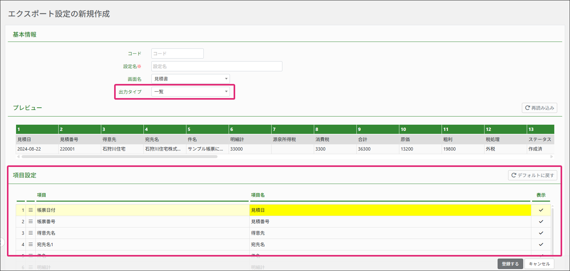「出力タイプ」の切り替えに連動し、「項目設定」も表示が切り替わります。