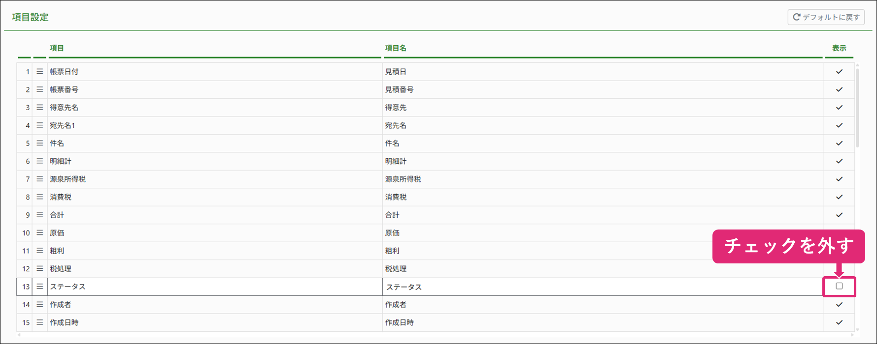 不要な項目はチェックを外す、必要な項目はチェックを入れる、の操作で出力項目をカスタマイズできます。