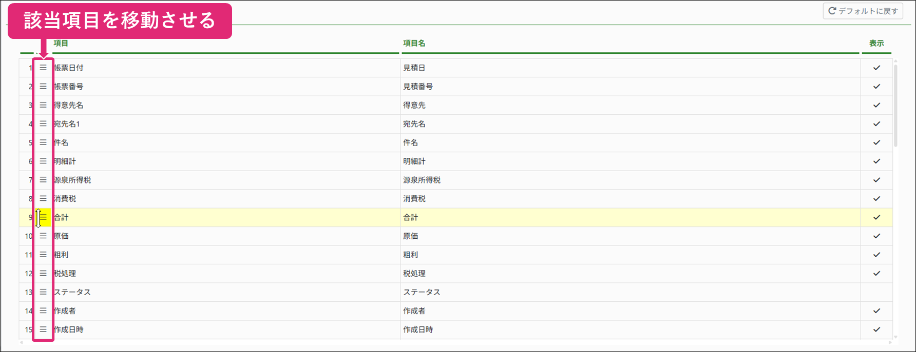 また、順序を変更することで出力項目の位置をカスタマイズできます。