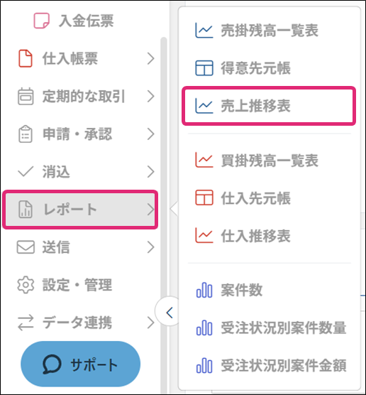 1. メニュー[レポート]→[売上推移表]をクリックします。