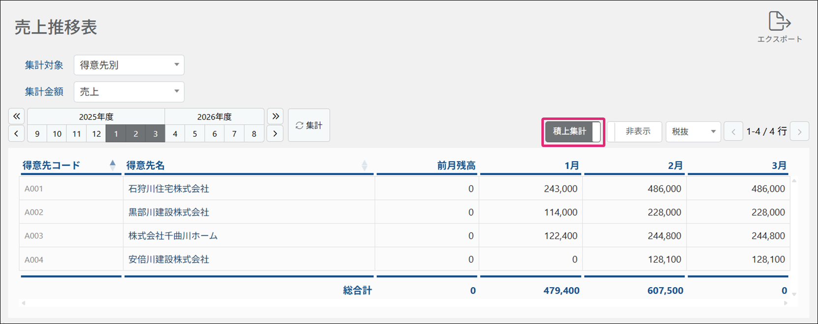 5. 月次推移を確認したい場合は、[積上集計]をクリックしONに切り替えます。