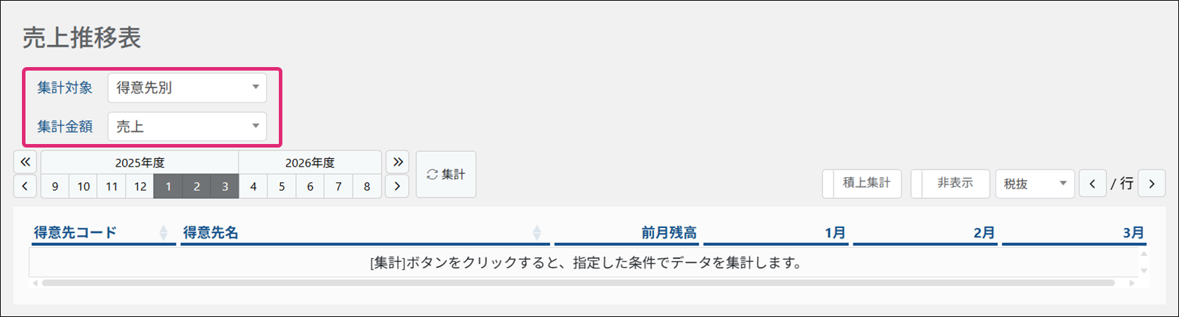 2. [売上推移表]画面が表示されます。集計対象・集計金額を選択します。