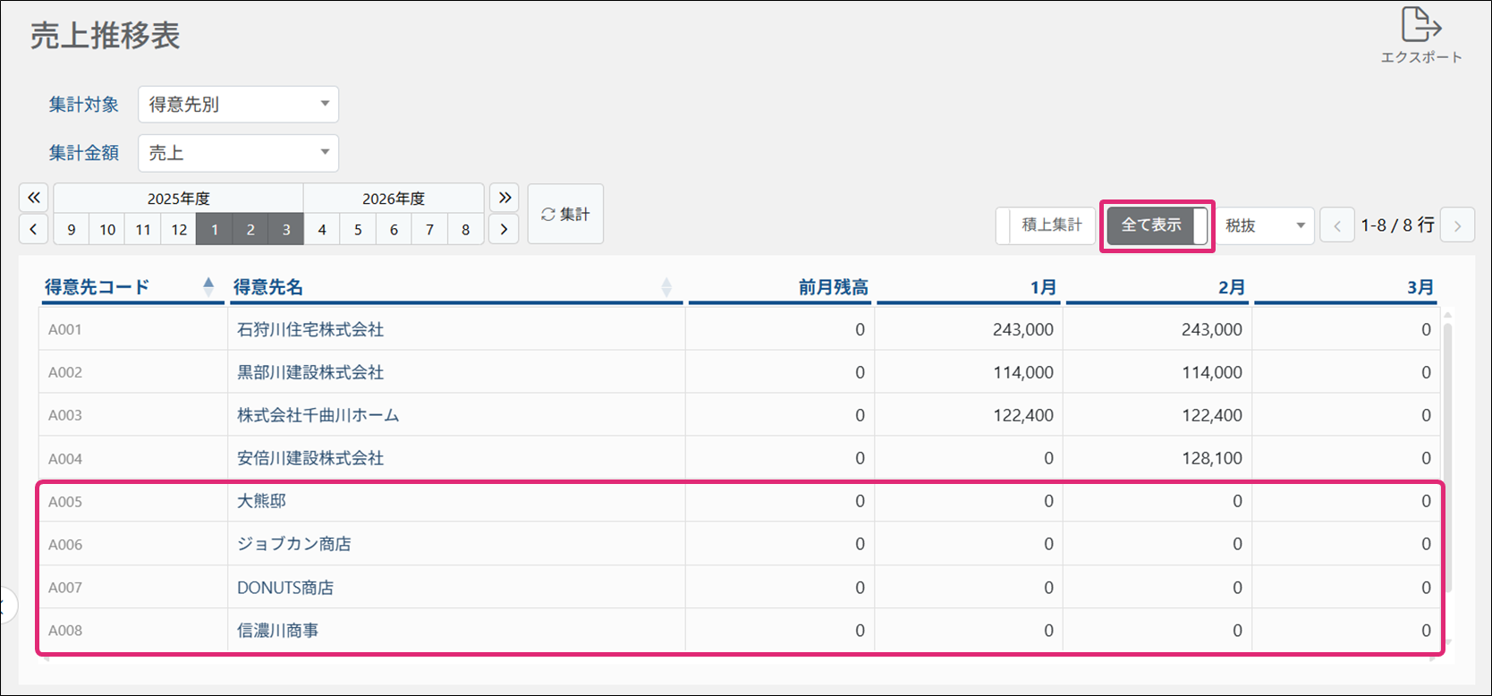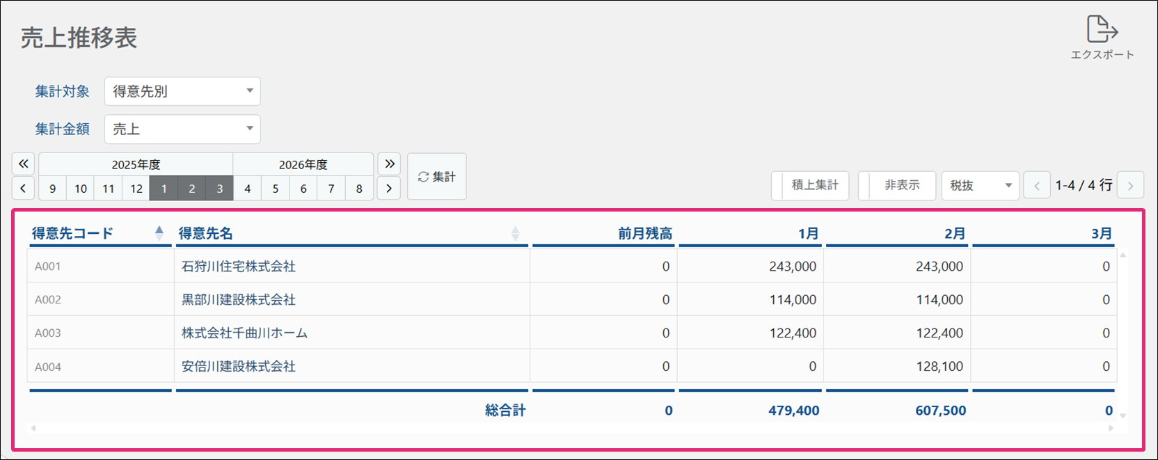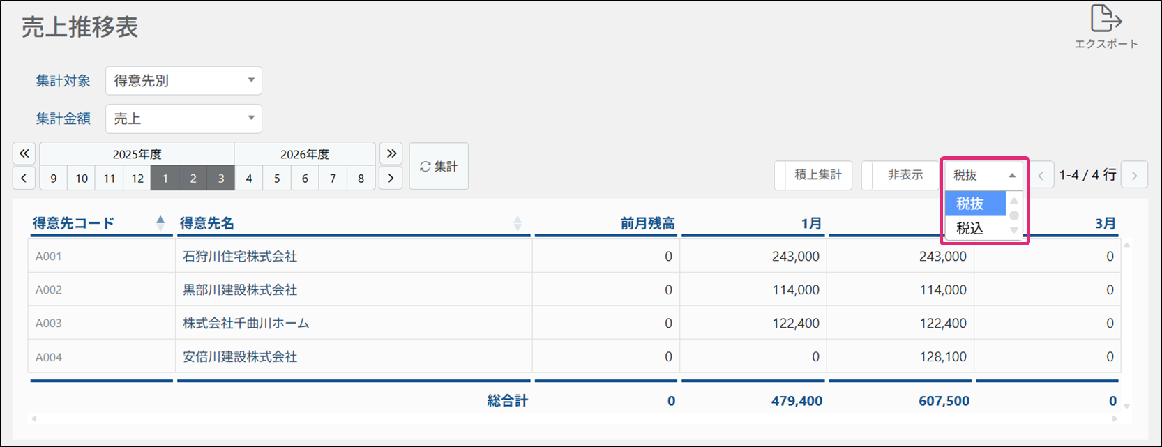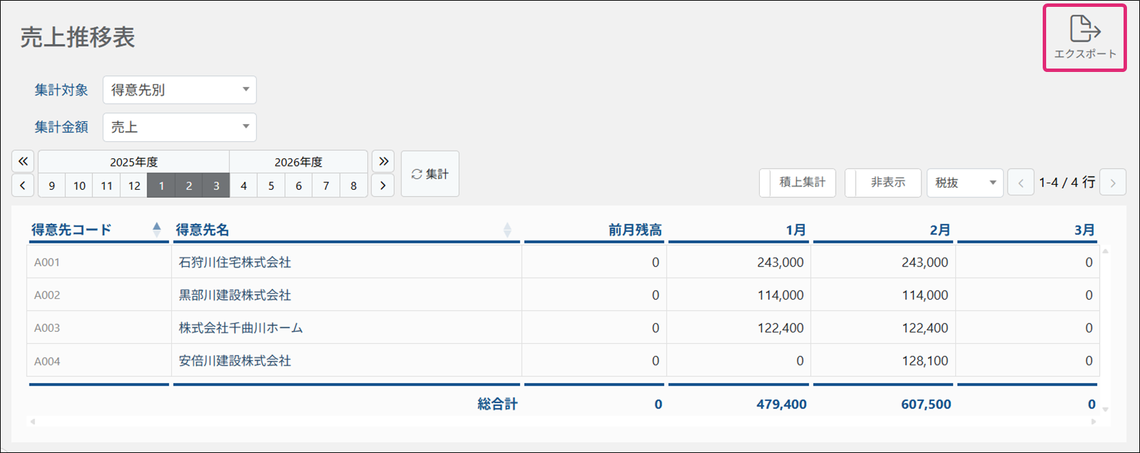 集計対象別(得意先・拠点・商品)に金額の推移を確認・エクスポートします。