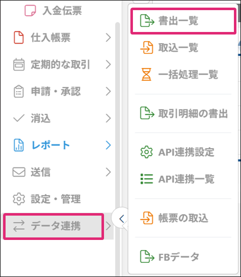 5. メニュー[データ連携]→[書出一覧]をクリックします。