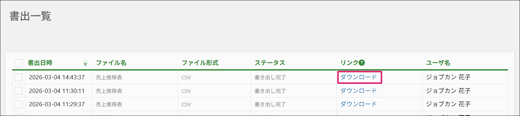 6. [書出一覧]画面が表示されます、該当データ行の[ダウンロード]をクリックします。