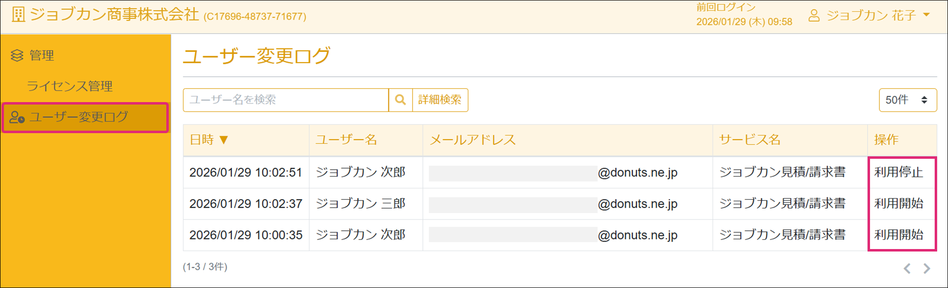 ユーザー変更ログでは、ユーザーを「利用する」「利用停止」に変更した際の変更履歴を確認できます。