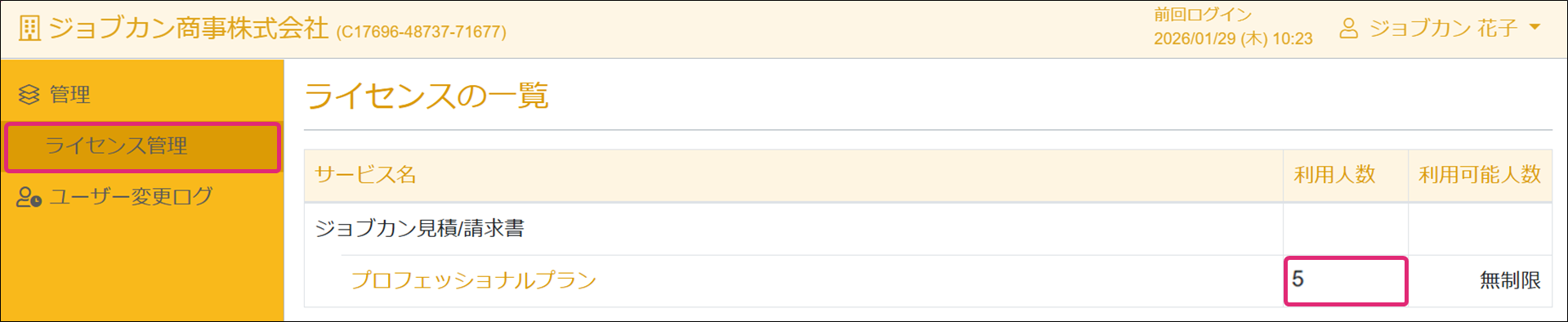 共通IDの管理者ユーザーは、見積/請求書のライセンス管理画面にて見積/請求書の利用人数などの確認が可能です。